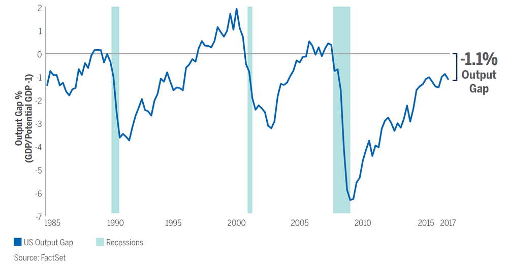 Now, however, the U.S. output gap is modestly negative, signaling that the economy has room to expand and support equities.