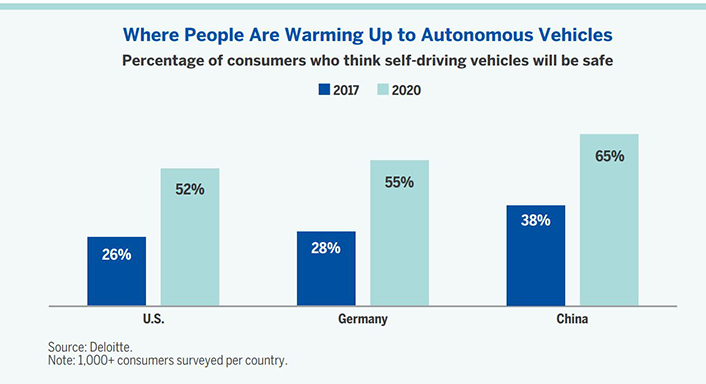 - Consumers have grown more comfortable with the expected safety of AVs in some very large economies. This bodes well for the future adoption of owned and hired AVs.
