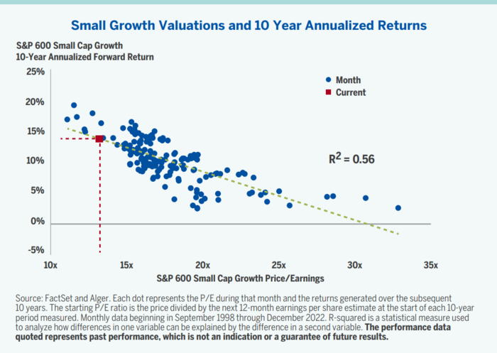 • The price-to-earnings (P/E) multiple of the S&P 600 SmallCap Growth index was one of the lowest that we have observed at the end of December 2022.