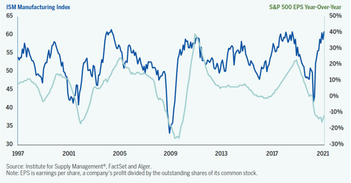 • Historically, there has been about an 80% correlation between the ISM Manufacturing Index and the S&P 500 earnings per share (EPS) year-over-year change. The index has led changes in earnings by about seven months and we believe its recent elevated level may imply 20%-40% growth in S&P 500 EPS to as much as $200 per share, potentially providing support for the stock market.