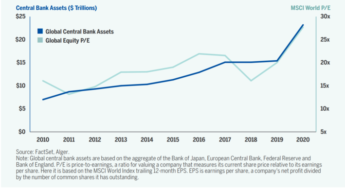 - While we believe multiple factors have driven equity P/E expansion, central bank balance sheet growth and its impact on liquidity and interest rates has played a significant role, in our view.