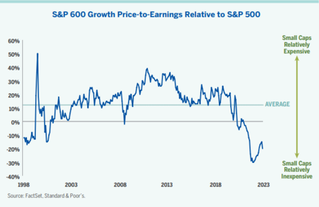 • As of March 31, 2023, the small cap growth index presented a P/E discount of about -20%. Moreover, small cap growth stocks are currently trading at a P/E discount below February 2001 levels.