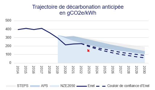 Il y a quelques mois, nous avons recalculé la trajectoire de décarbonation de l’entreprise via notre modèle Low Carbon Trajectory (LCT). Celle-ci illustre clairement la décarbonation drastique du mix d’Enel jusqu’en 2020 puis que son intensité remonte légèrement, pour atterrir à 229 gCO2e/kWh en 2022. Notre couloir de confiance montre qu’au vu des investissements réalisés par l’entreprise, nous ne nous attendions effectivement pas à ce qu’Enel atteigne son objectif.