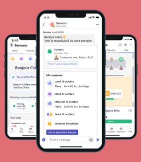 Semana vous aide à gérer l’organisation du flex office à travers des fonctionnalités de réservation des bureaux et ressources, de déclaration de présence, et de soutien du lien social. La solution s'intègre avec les outils SIRH, les calendriers et salles de réunion Microsoft et Google, et des outils de communication tels que Teams et Slack.